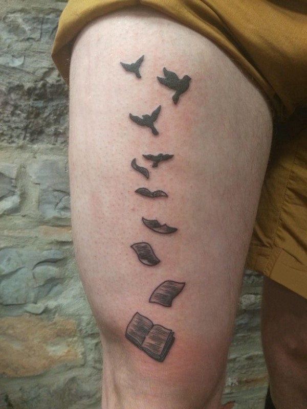 男生大腿上黑色点刺几何简单线条小动物轮廓和书籍纹身图片