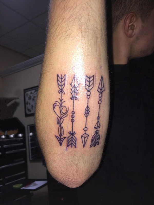男生手臂上黑色线条素描创意文艺箭纹身图片