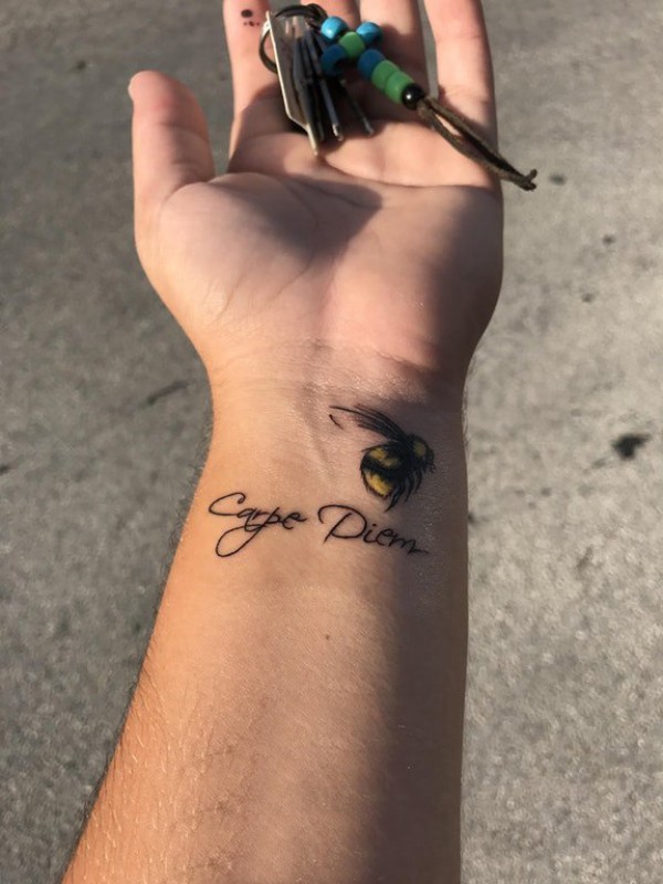 女生手臂上黑色线条素描创意花体英文纹身图片