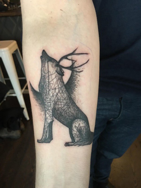 女生手臂上黑色点刺几何简单线条小动物狼纹身图片