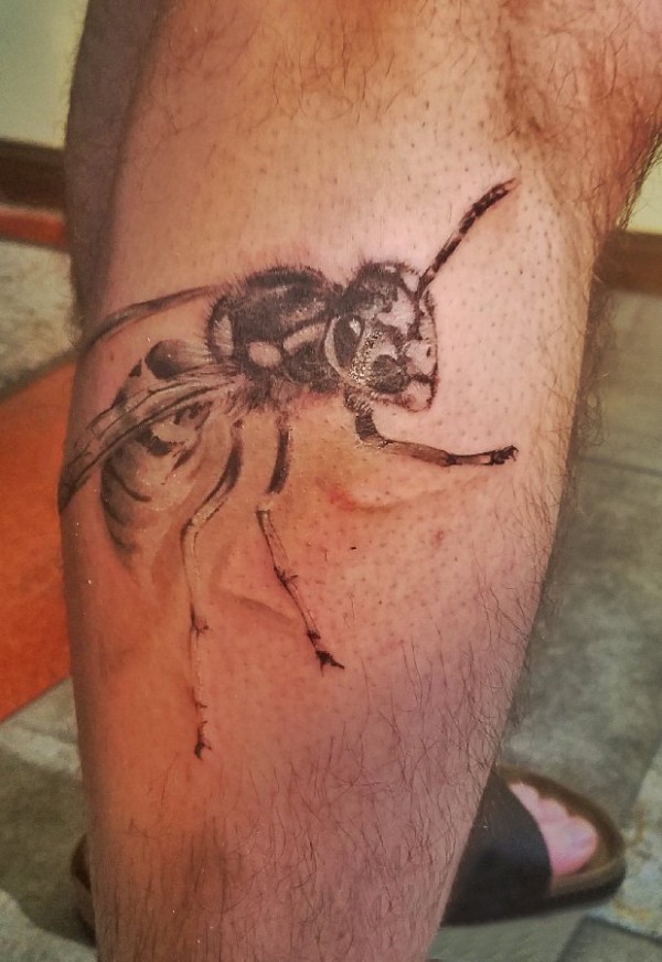 男生小腿上彩绘渐变简单线条小动物蜜蜂纹身图片