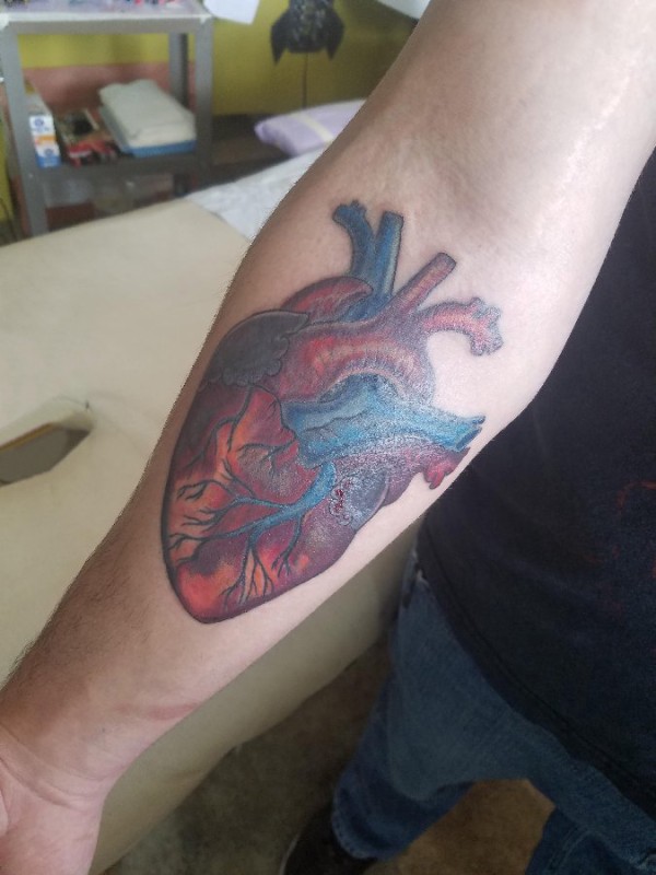 男生手臂上彩绘渐变抽象线条创意心脏纹身图片
