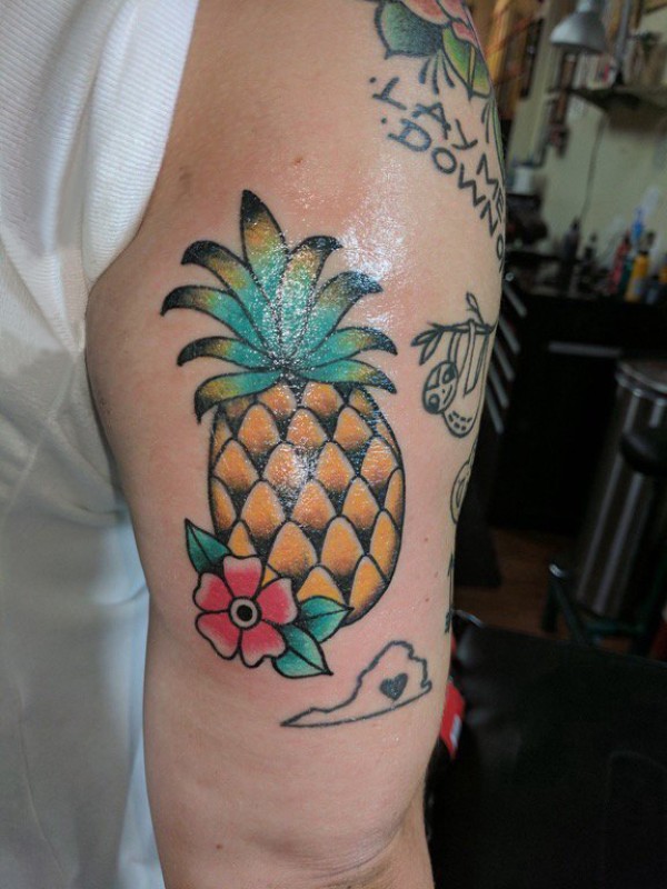 男生手臂上彩绘简单线条花朵和水果菠萝纹身图片