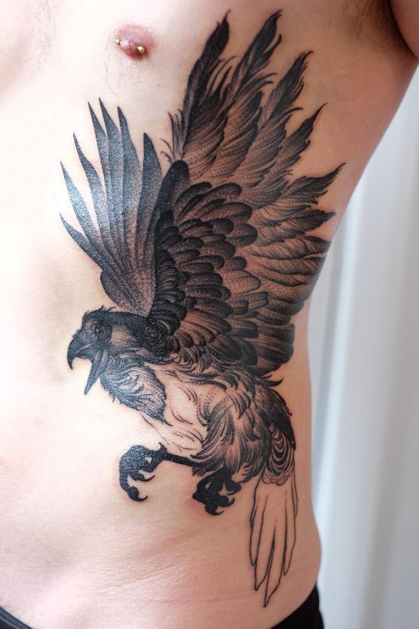 男生侧腰上黑色点刺简单线条写实小动物老鹰纹身图片