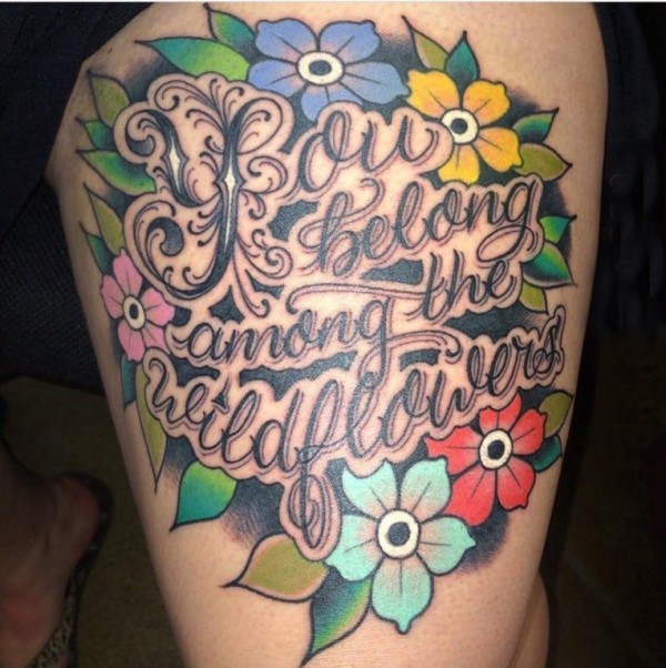 女生大腿上彩绘渐变简单线条英文和花朵纹身图片