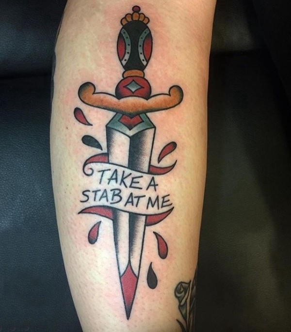 男生手臂上彩绘水彩素描创意霸气匕首纹身图片