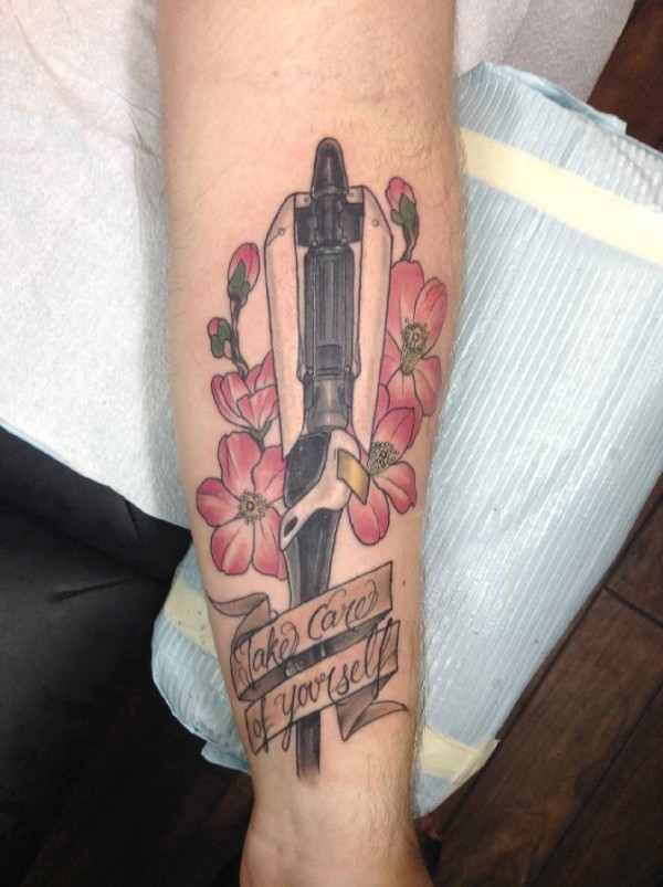 男生手臂上彩绘水彩素描霸气匕首纹身图片