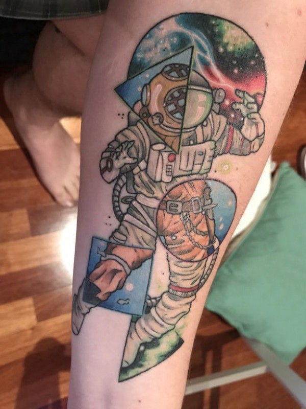 男生手臂上彩绘渐变几何简单线条星球和宇航员纹身图片