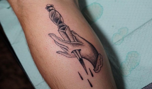男生小腿上黑色点刺简单线条手和匕首纹身图片
