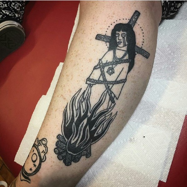 男生小腿上黑灰素描创意恐怖十字架火烧人物纹身图片