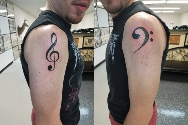 男生手臂上黑色线条文艺唯美经典音符纹身图片