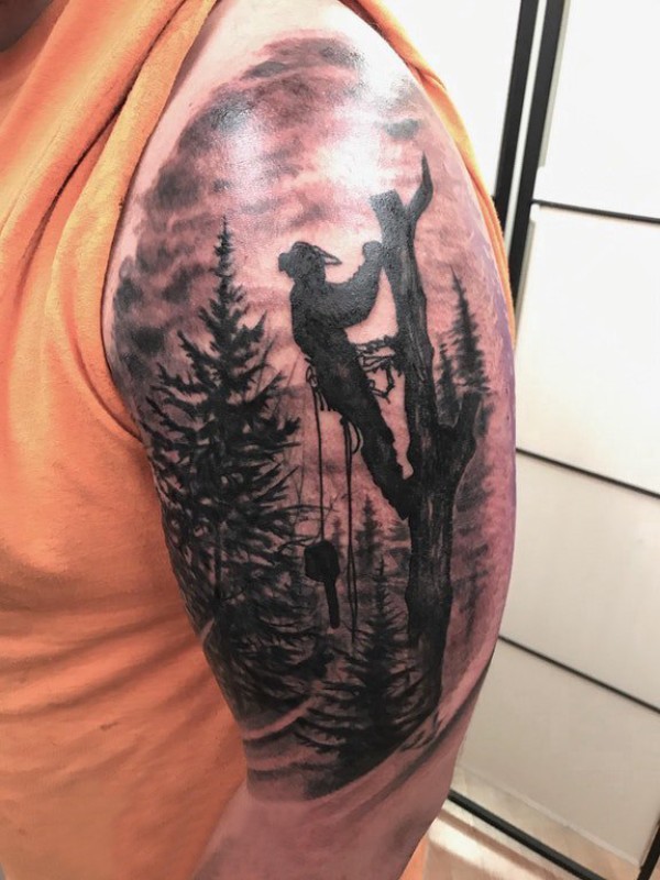 男生手臂上黑灰素描点刺技巧文艺风景精美纹身图片