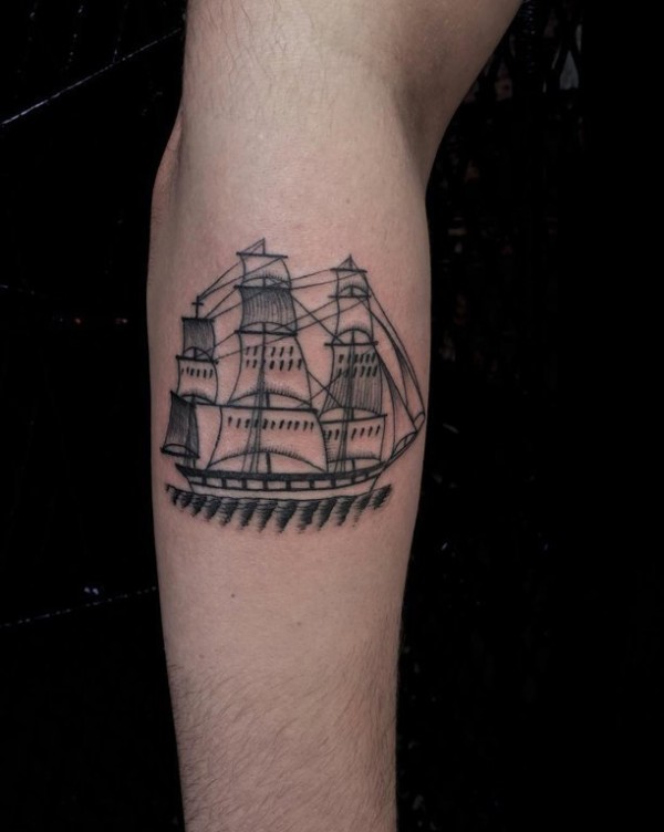 男生手臂上黑色点刺技巧几何简单线条帆船纹身图片