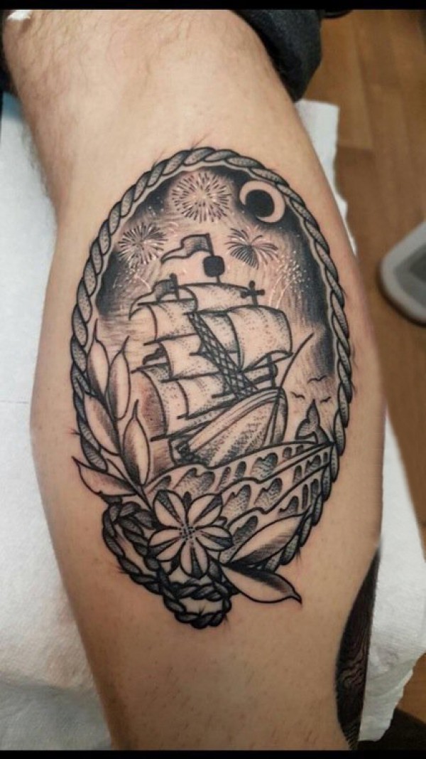 男生小腿上黑灰素描点刺技巧霸气经典帆船纹身图片
