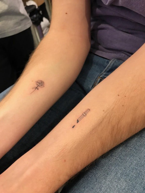 男生手臂上黑色点刺简单线条匕首和花朵纹身图片