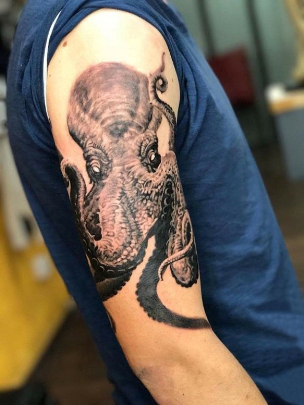 男生手臂上黑灰素描点刺技巧霸气章鱼纹身图片