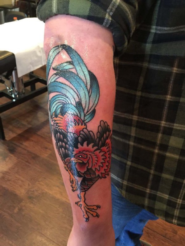 男生手臂上彩绘水彩素描创意霸气公鸡纹身图片