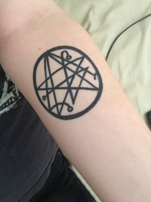 女生手臂上黑色几何简单线条圆形和五角星纹身图片
