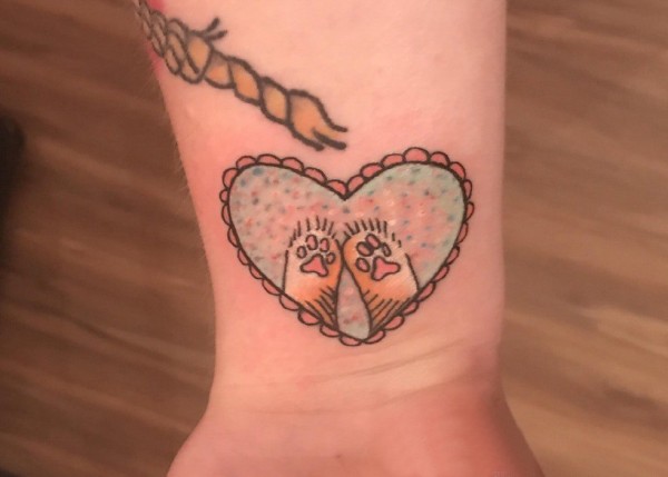 女生手腕上彩绘几何简单线条心形和动物爪子纹身图片