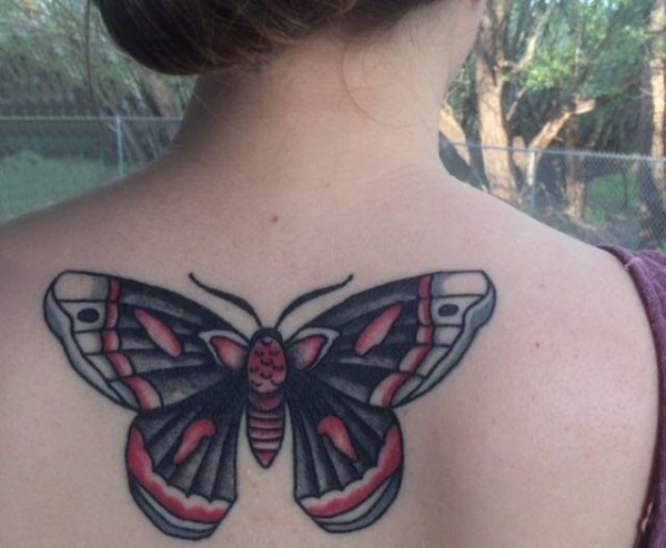 女生后背上彩绘几何简单线条小动物蝴蝶纹身图片