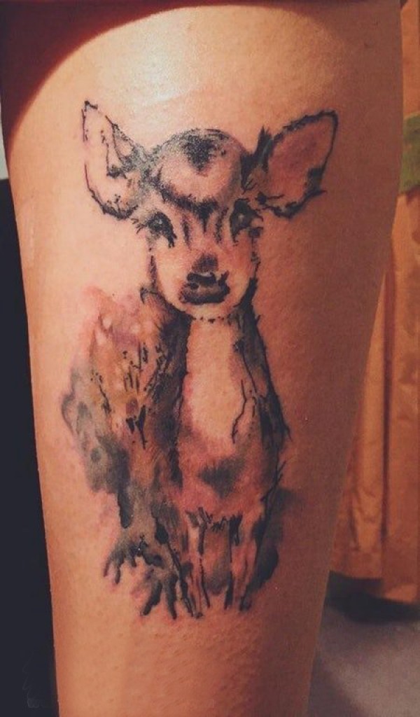 女生大腿上彩绘渐变抽象线条可爱小动物鹿纹身图片