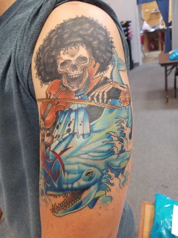 男生手臂上彩绘渐变简单线条动物和卡通骷髅纹身图片