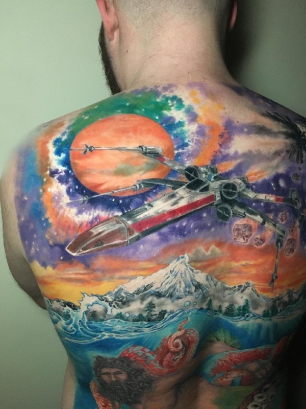 男生后背上彩绘渐变大面积山水风景和宇宙纹身图片