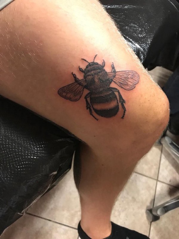 女生大腿上黑色点刺技巧简单线条小动物蜜蜂纹身图片