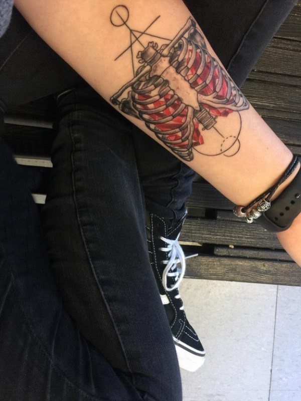 男生手臂上彩绘几何简单线条肋骨纹身图片