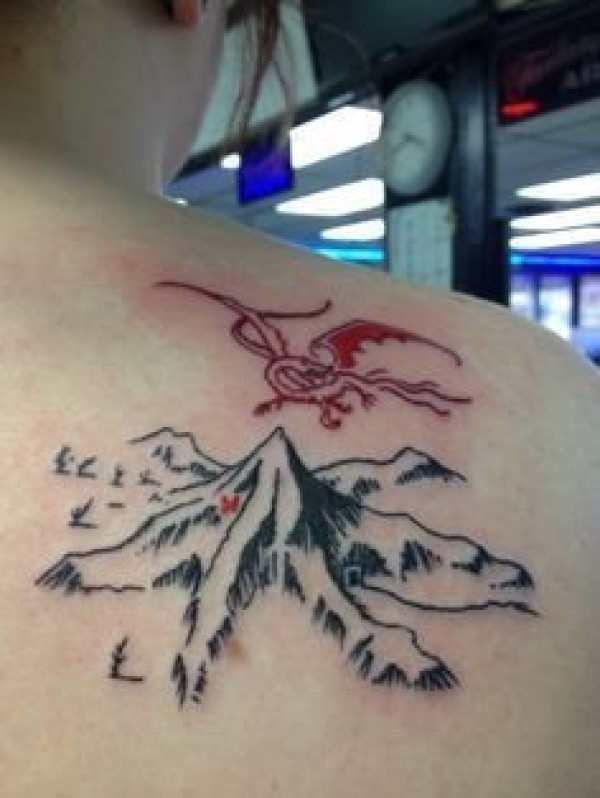 男生后背上黑色点刺抽象线条山脉纹身图片