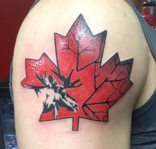 男生大臂上彩绘简单抽象线条植物枫叶纹身图片