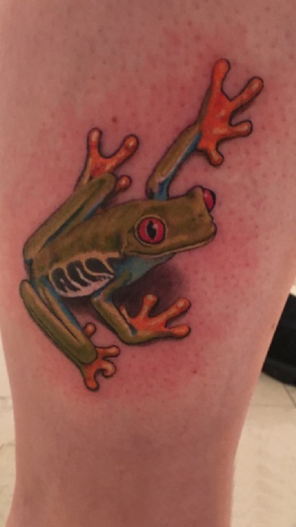 男生大腿上彩绘渐变写实小动物青蛙纹身图片