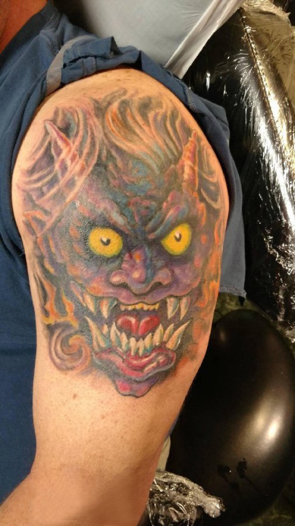 男生大臂上彩绘渐变抽象线条恐怖怪物纹身图片