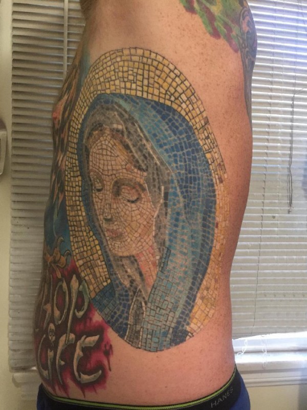 男生侧腰上彩绘几何简单线条拼接人物肖像纹身图片