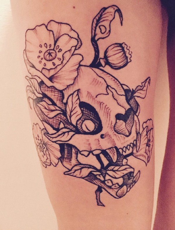 男生手臂上黑灰素描点刺技巧唯美花朵骷髅纹身图片