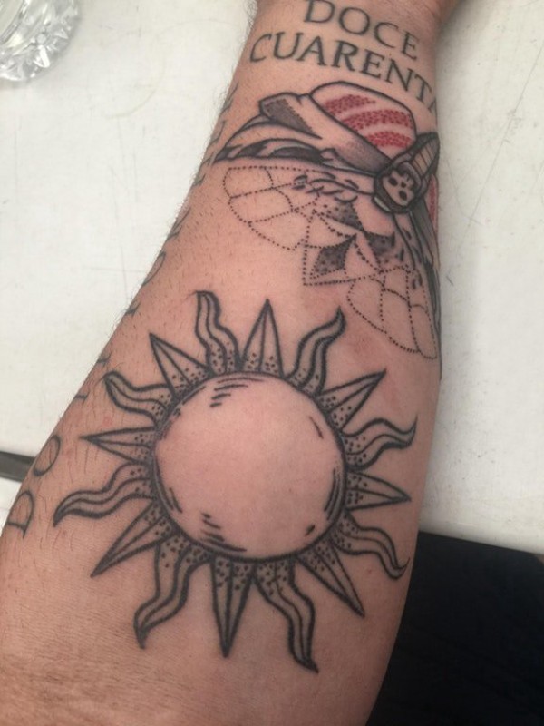 男生小腿上黑色点刺几何抽象线条太阳纹身图片