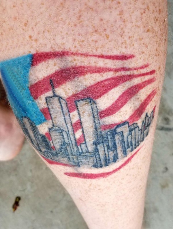 男生小腿上彩绘几何简单线条国旗和建筑物纹身图片