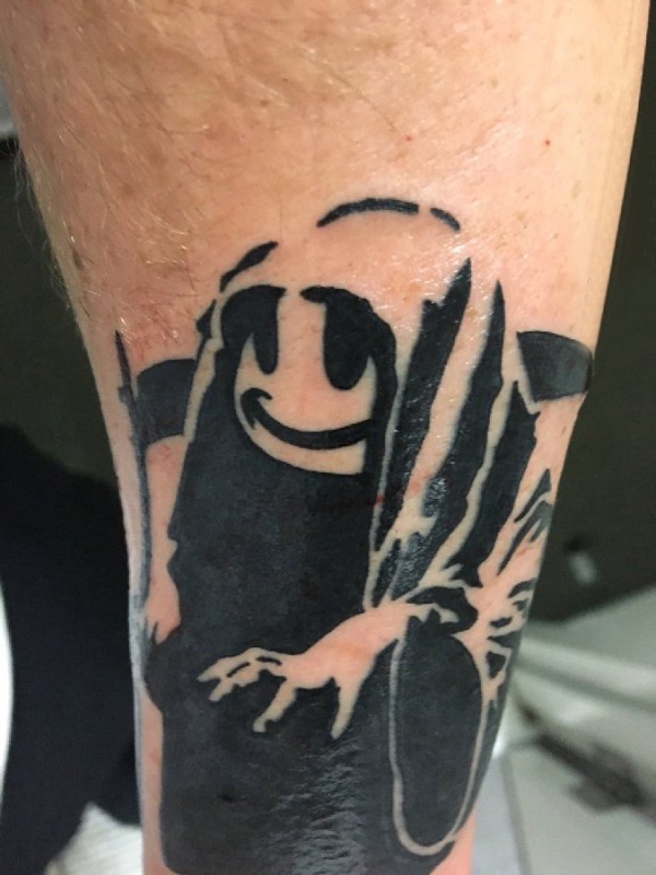 男生小腿上黑色点刺抽象线条卡通幽灵纹身图片