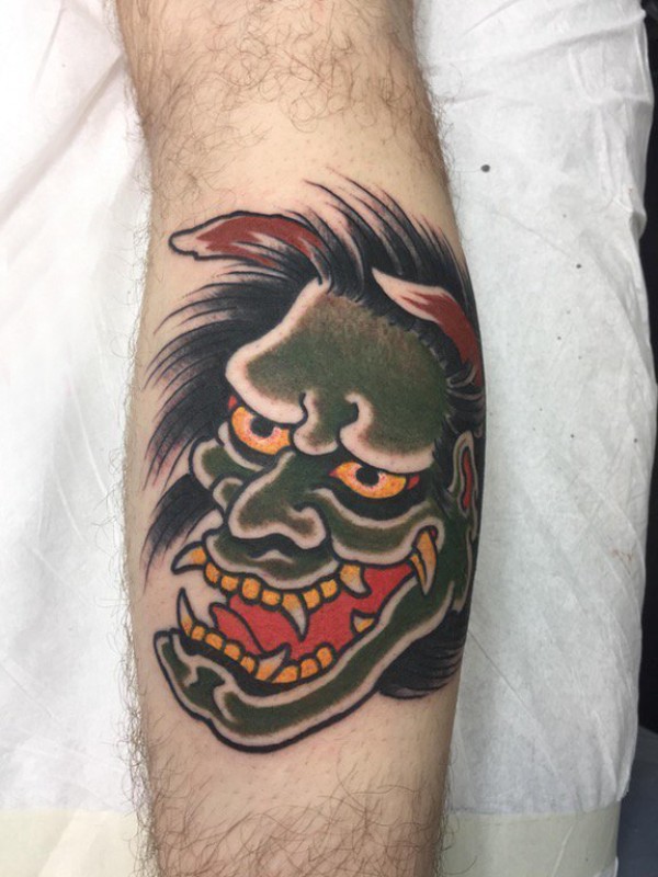 男生小腿上彩绘渐变简单线条恐怖般若纹身图片