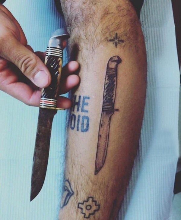 男生小腿上黑灰点刺几何简单线条匕首纹身图片