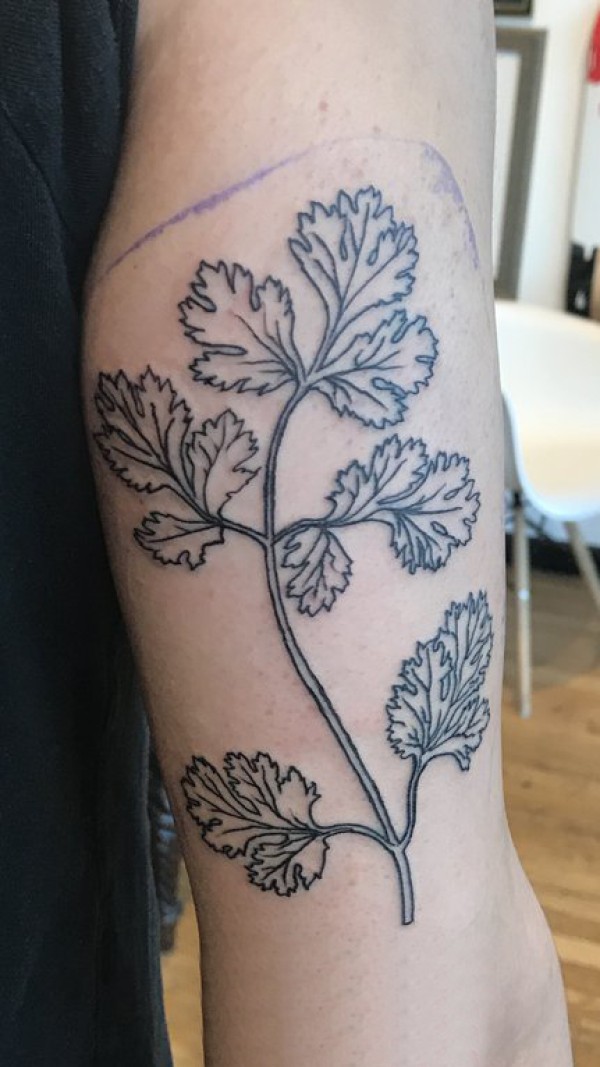 男生手臂上黑色简单线条小清新植物叶子纹身图片