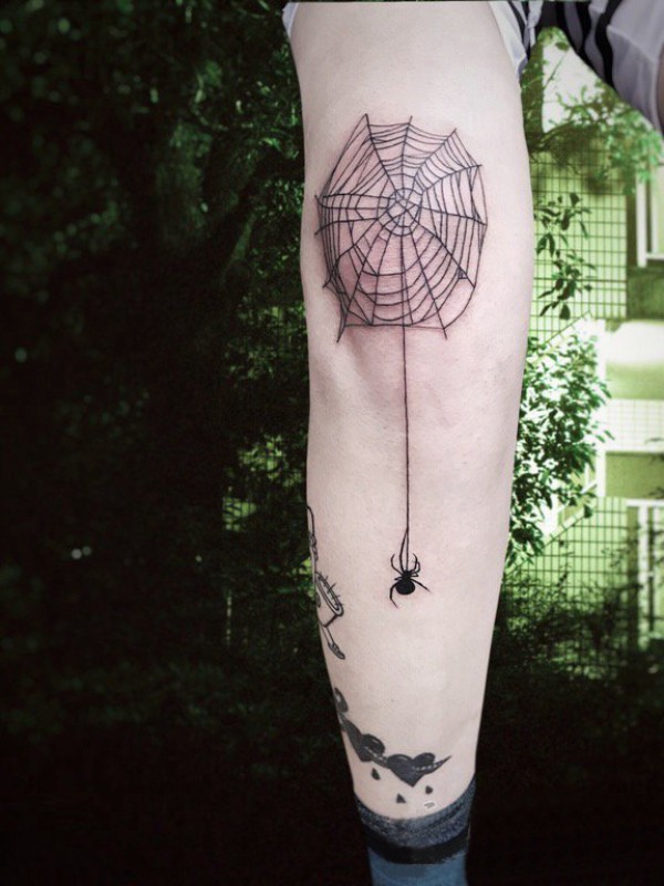 男生手臂上黑色几何简单线条蜘蛛网纹身图片