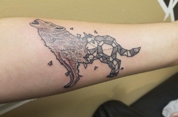 男生手臂上黑色点刺几何简单线条小动物狼纹身图片