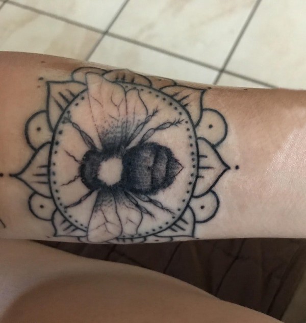 男生手臂上黑色点刺几何简单线条花朵和蜜蜂纹身图片