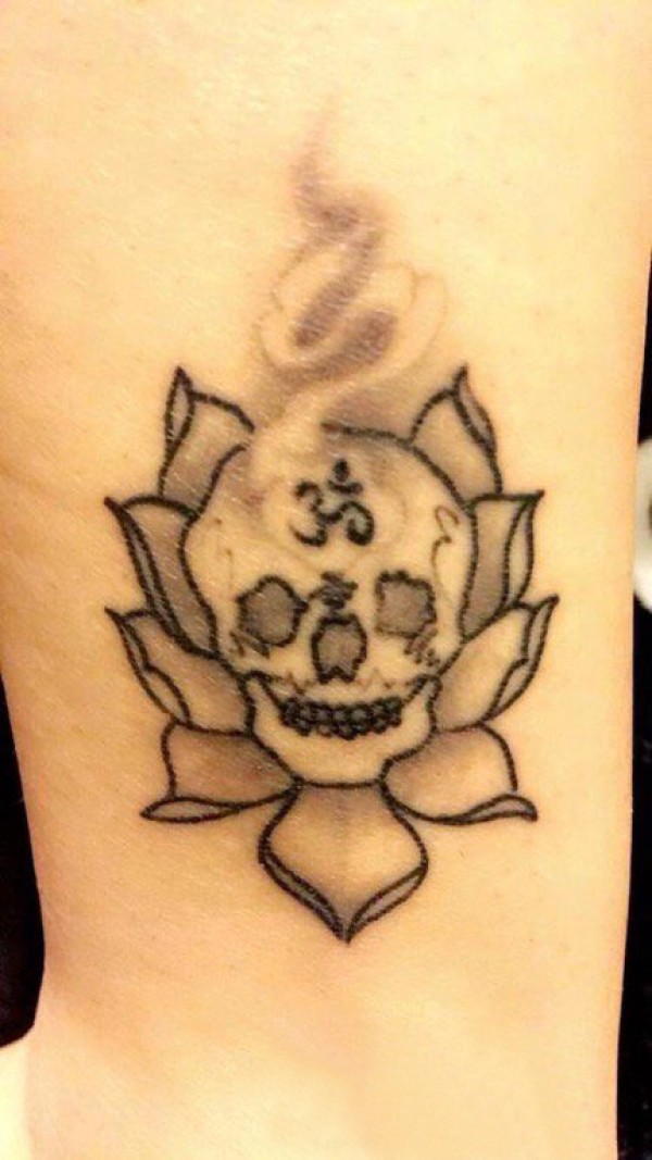 女生小腿上黑色点刺抽象线条植物花朵和骷髅纹身图片