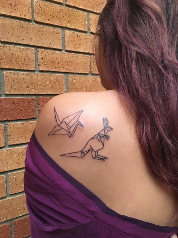 女生后肩上黑色几何简单线条折纸千纸鹤和袋鼠纹身图片