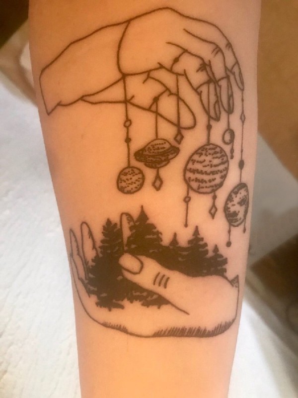 女生大腿上黑色点刺简单线条手和星球纹身图片
