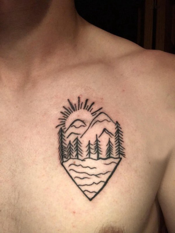 男生胸部黑色几何抽象线条山水风景纹身图片