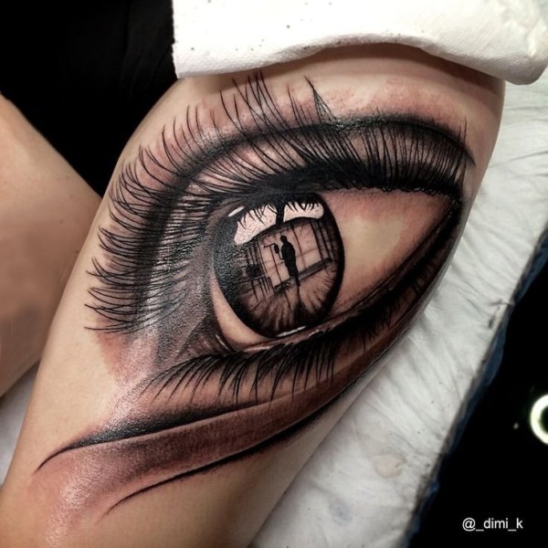 女生大腿上黑灰素描点刺技巧文艺唯美眼睛纹身图片
