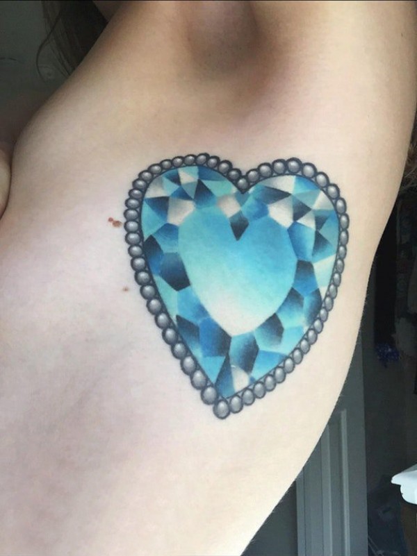 女生侧腰上蓝色渐变几何线条心形钻石纹身图片